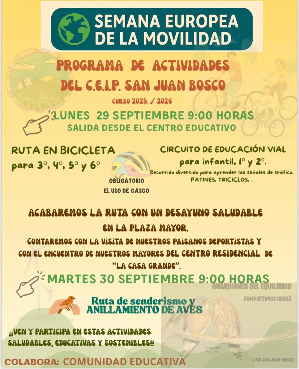 Esta actividad se desarrollará durante el próximo lunes, día 29. La ruta ciclista recorrerá el entorno cercano de San Carlos, y el circuito de educación vial se llevará a cabo en las plazas del centro de nuestra localidad, utilizando triciclos y patinetes.